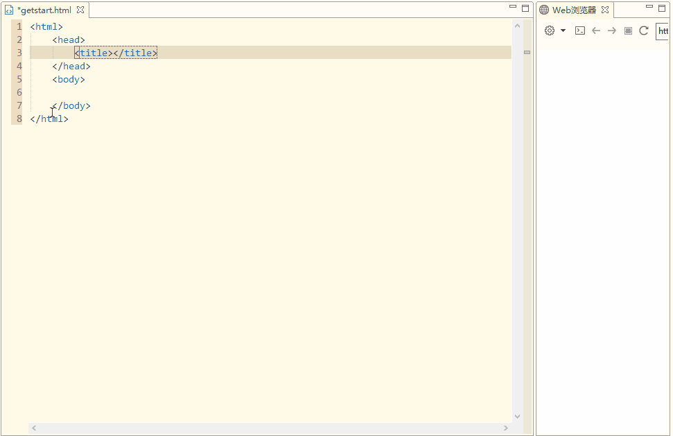 新建html基本模板后,當(dāng)前光標(biāo)處于title標(biāo)簽內(nèi),此時我們給HTML設(shè)置title:hellohbuilder,完成后使用Ctrl+回車在當(dāng)前的下一行插入空行,并將光標(biāo)移動到下一行