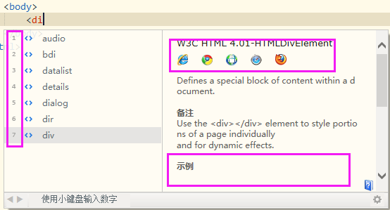 如上圖所示,代碼助手左側(cè)包含數(shù)字,可以使用這些數(shù)字選擇對應(yīng)的條目,右側(cè)包含瀏覽器兼容性數(shù)據(jù)及示例