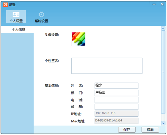 通過“個人設(shè)置”,用戶可以自定義頭像、修改簽名、姓名、部門等信息,點擊保存后,局域網(wǎng)用戶可以查看到您設(shè)置的信息。