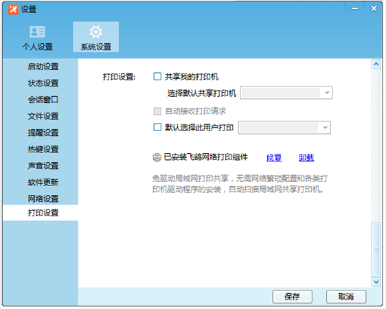 飛鴿網(wǎng)絡(luò)打印方便用戶在局域網(wǎng)內(nèi)共享已經(jīng)連接的物理打印機,允許其他飛鴿用戶請求使用您的打印機打印各類文檔和圖片,在使用飛鴿網(wǎng)絡(luò)打印前,需要在系統(tǒng)設(shè)置中安裝飛鴿網(wǎng)絡(luò)打印組件。