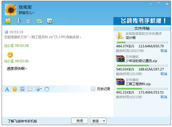 飛鴿傳書對文件傳輸做了很大的用戶改善,除了可以通過聊天窗口選擇發(fā)送文件,還可以將待發(fā)送文件直接拖到好友列表的頭像或聊天窗口內(nèi)實現(xiàn)發(fā)送。