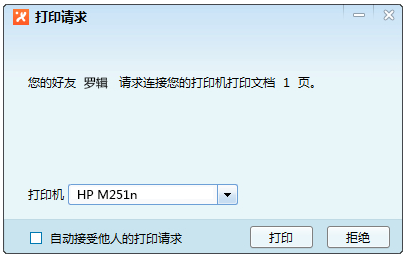 對方在收到您打印請求后,可以選擇同意或拒絕打印,如果對方設(shè)置為自動接收打印請求,則無需經(jīng)過同意,自動打印。