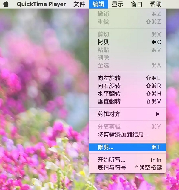 1、首先使用QuickTime Player打開視頻文件(右鍵選擇打開方式,或者將視頻文件拖到Dock中QuckTime Player的圖標中),在上方菜單選擇:編輯——修剪,之后視頻中原本的時間進度條就變成了黃色框的時間軸。