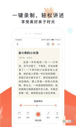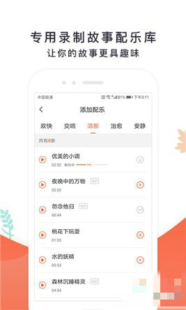 4、配樂錄制:7大類近百首專業(yè)故事配樂,不同故事配不同配樂,錄制一鍵合成,一鍵分享;