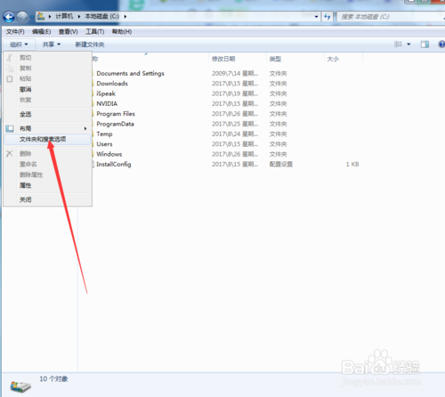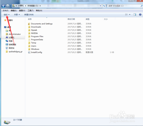 2、點(diǎn)擊導(dǎo)航欄上的“組織”,選擇“文件夾和搜索選項(xiàng)”。