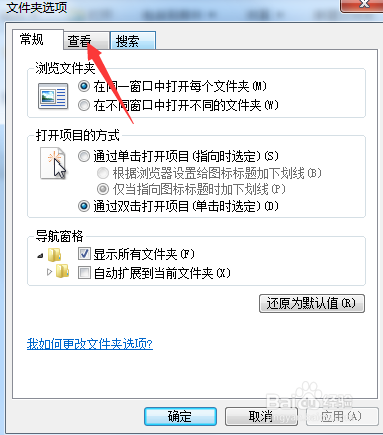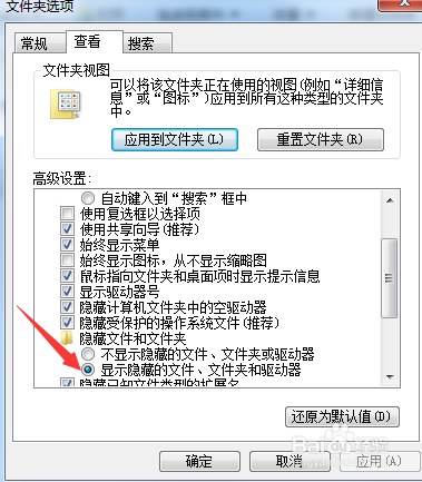 3、在文件夾選項(xiàng)窗口中,切換到“查看”標(biāo)簽頁,在高級設(shè)置欄目下,點(diǎn)選“顯示隱藏的文件、文件夾和驅(qū)動器”,點(diǎn)擊“確定”。