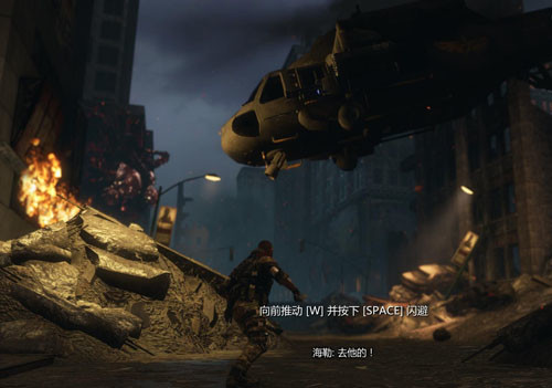 按提示按鍵(W+空格)躲避墜落的直升機(jī),出現(xiàn)一只大家伙!
