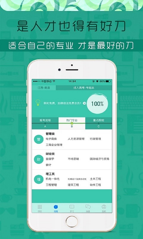 伴我考成人高考app,專業(yè)的成考輔導手機APP。伴我考成人高考app提供全套免費復習資料、歷年真題解析、名師視頻課件、名師直播課堂和考前押題試卷。同時伴我考成人高考app提供成人高考全程免費流程指引,從報名、審核、考試、現(xiàn)場確認、繳費、填報志愿、錄取、論文答辯到領(lǐng)取畢業(yè)證等共20多個步驟,提供時間提醒、真實官網(wǎng)、資料準備、辦事程序等。伴我考成人高考還專門為您推薦重點院校及熱門專業(yè),并根據(jù)專業(yè)熱度指引未來的就業(yè)方向、提供詳細的課程計劃。從擇校到畢業(yè)一站式解決,助您早日獲取畢業(yè)證!