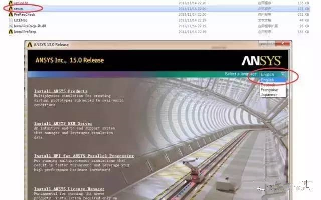 6、點擊運行”DISK1“中的“setup”,彈出ANSYS 15.0安裝界面,選擇語言為英文,點擊“Install ANSYS Products”開始安裝