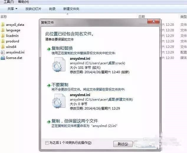 21、將crack文件夾下修改后的ANSYSlmd.ini和license.dat復制到C:\ProgramFiles (x86)\ANSYS\ANSYS Inc\Shared Files\Licensing文件夾下,替換掉原先的文件即可完成破解。如下圖所示