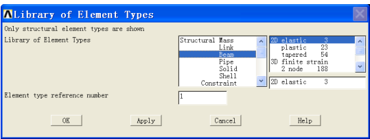 d. 在右邊單元列表中選擇 2D elastic 3 (BEAM3).