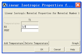 !材料屬性是與幾何模型無關的本構屬性,例如楊氏模量、密度等. 雖然材料屬性并不與單元類型聯(lián)系在一起,但由于計算單元矩陣時需要材料屬性,ANSYS為了用戶使用方便,還是對每種單元類型列出了相應的材料類型. 根據(jù)不同的應用,材料屬性可以是線性或非線性的. 與單元類型及實常數(shù)類似,一個分析中可以定多種材料. 每種材料設定一個材料編號(材料參考號). 對于本問題,只須定義一種材料,這種材料只須定義一個材料屬性—楊氏模量 3.0e7 kPa=3.0e4N/mm2.