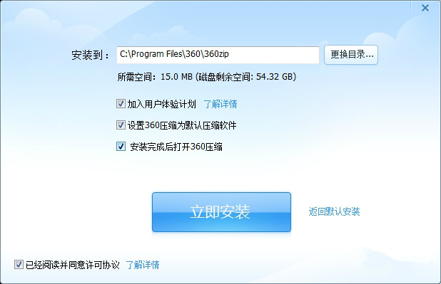 第二步:點(diǎn)擊【自定義安裝】按鈕選擇安裝目錄,可選擇是否加入用戶體驗(yàn)計(jì)劃、是否設(shè)置360壓縮為默認(rèn)壓縮軟件、是否安裝完成后打開360壓縮軟件。