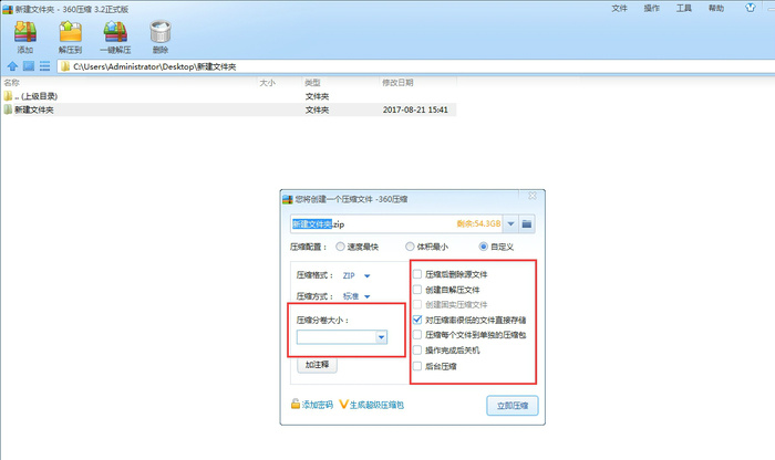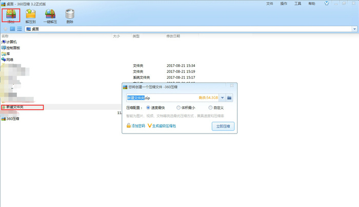 打開360壓縮軟件,選中一個(gè)或多個(gè)文件后,點(diǎn)擊軟件主界面左上角的【添加】圖標(biāo),并在新彈出的【準(zhǔn)備壓縮】窗口中設(shè)置好壓縮選項(xiàng)后,點(diǎn)擊【立即壓縮】即可對文件進(jìn)行壓縮。