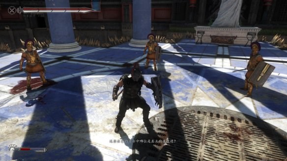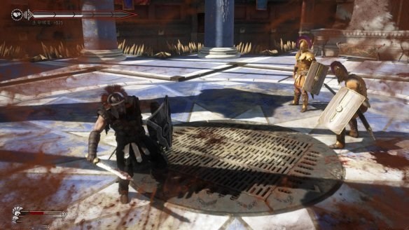 第一個(gè)“庭院Courtyard”是廣闊卻充滿著沙石的空間,但并沒有更多顯著的地形環(huán)境。游戲一開始非常直接,跳出了一波野蠻人的部隊(duì),去把他們?nèi)冀o砍倒吧!但接著游戲就開始變得更加有趣了,針刺與火焰的陷阱開始從地面竄出,讓我們不得不閃避這些額外的災(zāi)害地區(qū)(或者是把我們的敵人給打進(jìn)去)。接著戰(zhàn)斗中的目標(biāo)就變更了,迫使我們必須採取防御姿態(tài)先清空一個(gè)區(qū)域中的入侵者, 接著又放出了一些比一般野蠻人更強(qiáng)大的領(lǐng)隊(duì)出來。游戲中的操作非常令人熟悉,利用武器劈砍的連段與利用盾牌招架敵人攻擊,雖然有些時(shí)候競(jìng)技場(chǎng)中的黑影會(huì)讓游戲的視角沒辦法鎖定在我們角斗士的肩膀上,讓人不知道現(xiàn)在戰(zhàn)場(chǎng)上究竟發(fā)生了什么事情(但狂按攻擊通常就能讓你度過這種狀況)。