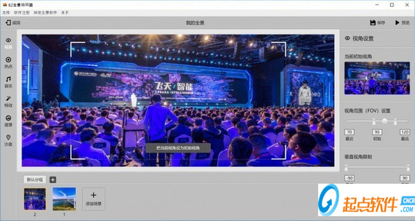 在全景編輯頁(yè),你可以編輯初始視角,添加熱點(diǎn),添加音樂,特效,遮罩,沙盤等