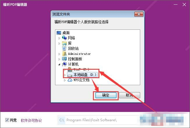 3、需要更改軟件安裝路徑的朋友們可以點擊安裝向?qū)в蚁陆堑腫安裝選項],安裝向?qū)в刑峁┠J(rèn)的安裝路徑:C:\Program Files\Foxit Software\。點擊安裝路徑右邊的文件夾圖標(biāo),打開文件夾選擇窗口,選擇好安裝路徑文件夾就可以點擊[確定]完成安裝路徑修改;