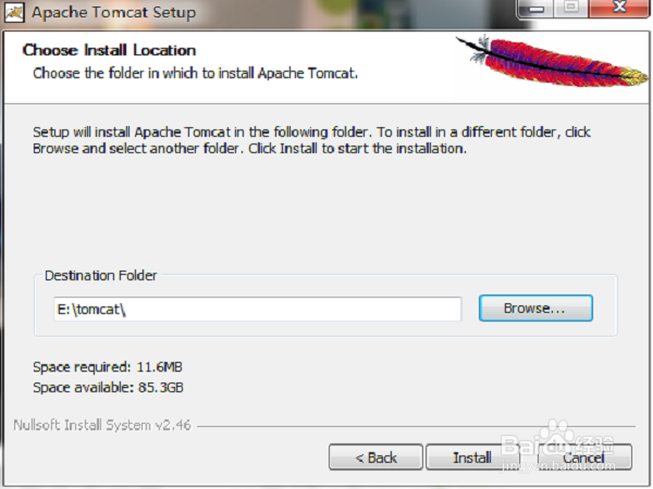 選擇tomcat的安裝位置,可以默認(rèn)安裝,也可以自定義安裝。這里我選擇自定義。