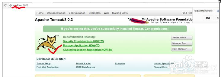 打開命令提示符,輸入:startup 出現(xiàn)下圖就表示配置成功了。啟動(dòng)Tomcat 后可以在瀏覽器中輸入:localhost:8080,出現(xiàn)有個(gè)貓的界面。我的端口8080被占用,改為8081了。