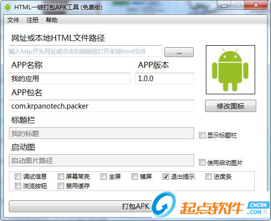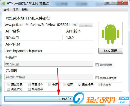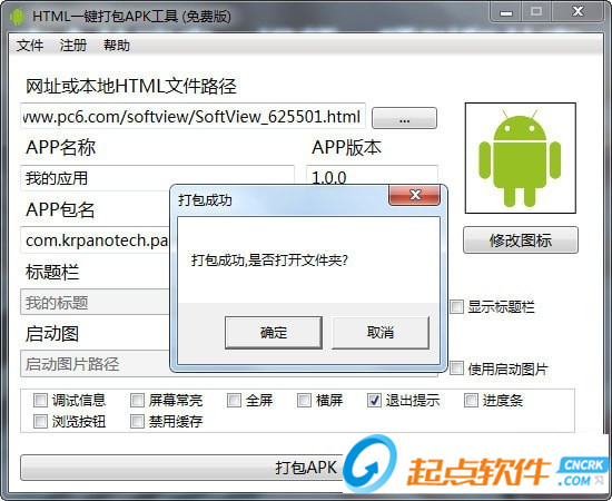 3.支持自定義圖標(biāo),自定義APP名稱,自定義包名,全屏,橫屏,退出提示,保持常亮等選項