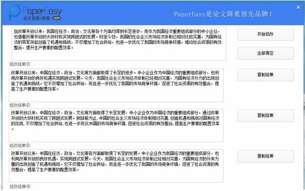 PaperEasy論文修改助手使用操作簡(jiǎn)單,一鍵修改,沒有復(fù)雜的操作,下載立刻使用,綠色支持免費(fèi)試用。大學(xué)生修改降低論文重復(fù)率的神器!