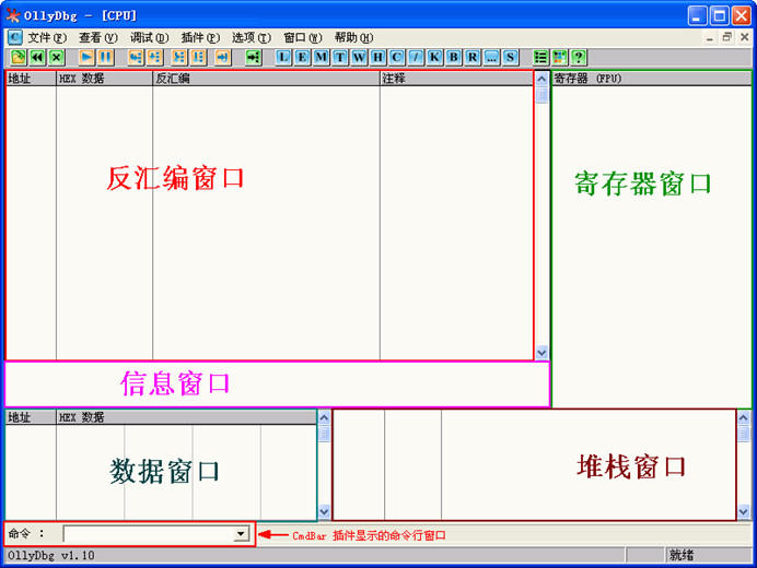 OllyDBG 中各個(gè)窗口的功能如上圖。