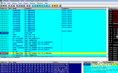 可以看到ollydbg的經(jīng)典四個(gè)布局,反匯編區(qū)域、寄存器區(qū)域、內(nèi)存區(qū)域、堆棧區(qū)域。