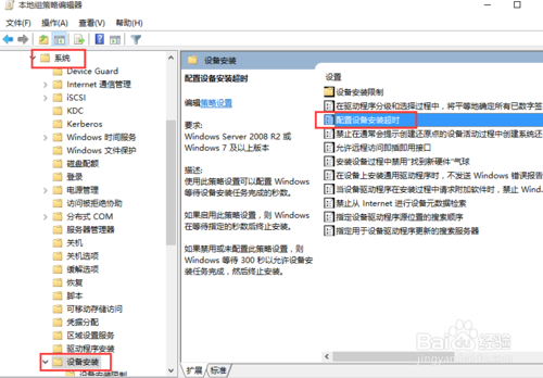 選擇計算機(jī)配置→管理模板→系統(tǒng)→設(shè)備安裝,然后在右邊找到“配置設(shè)備安裝超時”并雙擊打開,如下圖所示: