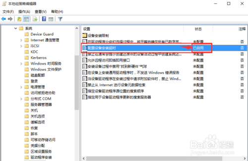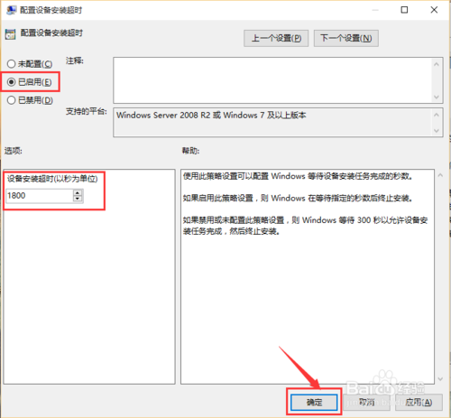 在窗口左上方選擇“已啟用”,然后在左邊中間位置“設(shè)備安裝超時”中設(shè)定“1800”秒后單擊確定,如下圖所示: