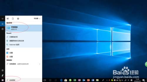 如圖所示,搜索框輸入"控制面板"。Cortana(小娜)顯示搜索結(jié)果,點擊"最佳匹配→控制面板"項。
