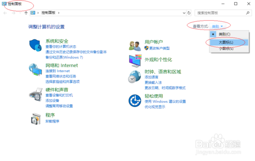 喚出"控制面板"程序窗口,如圖所示。點擊"查看方式"右側(cè)向下箭頭,彈出下拉列表選擇"大圖標(biāo)"項。
