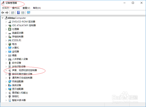 彈出"設(shè)備管理器"對話框,如圖所示。展開樹形目錄結(jié)構(gòu),點擊"聲音、視頻和游戲控制器"項。