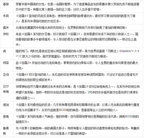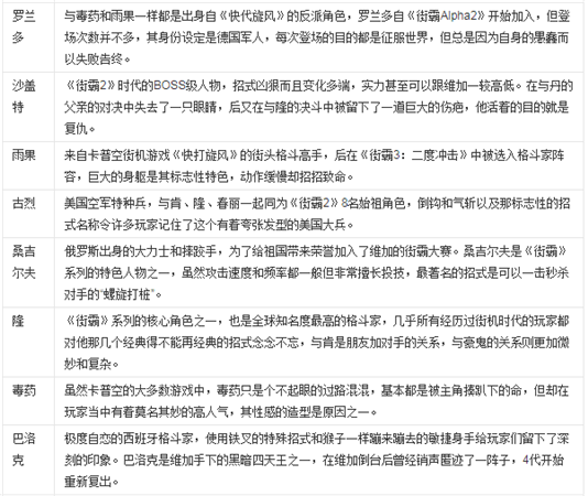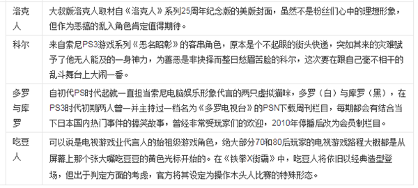 其中《街霸》和《鐵拳》分別可操控角色19人,亂入角色可操控5人分別是《聲名狼藉》系列主角科爾、《隨身玩伴一起上學(xué)?!分械亩嗔_、庫(kù)羅,以及洛克人和吃豆人。