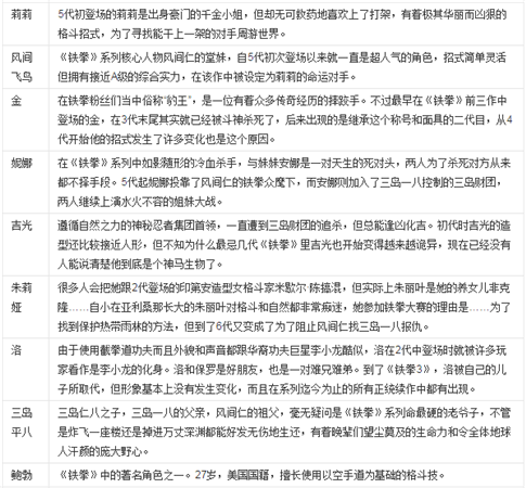 5代初登場(chǎng)的莉莉是出身豪門的千金小姐,但卻無(wú)可救藥地喜歡上了打架,有著極其華麗而兇狠的格斗招式,為了尋找能干上一架的對(duì)手周游世界。在《鐵拳5》中輸給風(fēng)間飛鳥后一直念念不忘,官方將兩人定位成朋友加對(duì)手。