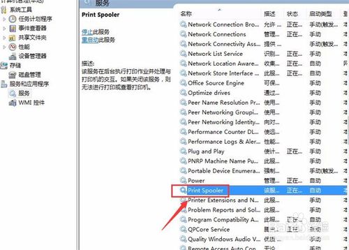 開(kāi)啟打印機(jī)服務(wù):鼠標(biāo)右鍵點(diǎn)擊桌面上的計(jì)算機(jī)圖標(biāo),然后選擇”管理“,進(jìn)入計(jì)算機(jī)管理界面后點(diǎn)擊”服務(wù)和應(yīng)用程序“,然后在彈出的選項(xiàng)中點(diǎn)擊”服務(wù)“,如圖所示:
