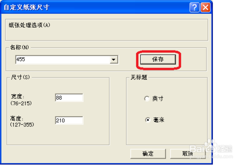 2、設(shè)置好自定義尺寸后先點(diǎn)保存,再點(diǎn)確定