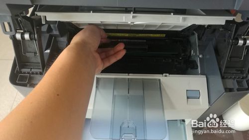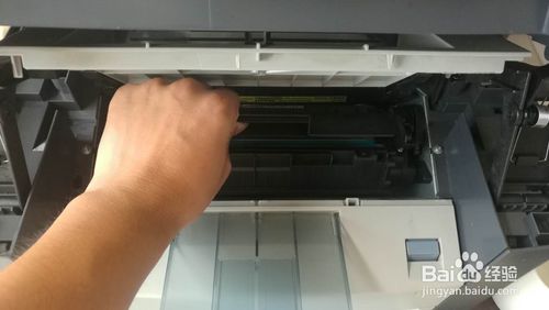 按住按鈕,把打印機(jī)的面就可以朝上掀起來(lái)了,這個(gè)時(shí)候我們就可以看到墨盒了。