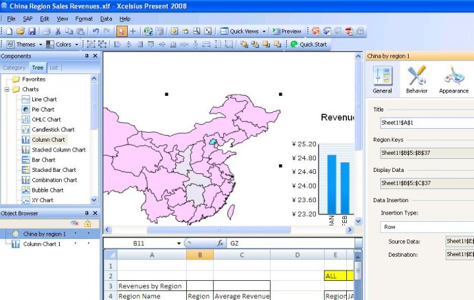 水晶易表算是一個(gè)獨(dú)立的Excel的插件,它可以連接 Excel 表格、通過(guò) web service 和XML連接其他外部數(shù)據(jù)源,從而將傳統(tǒng)的 Excel 表格及靜態(tài)數(shù)據(jù)轉(zhuǎn)換為引人入勝的交互式可視化分析。