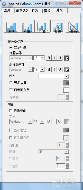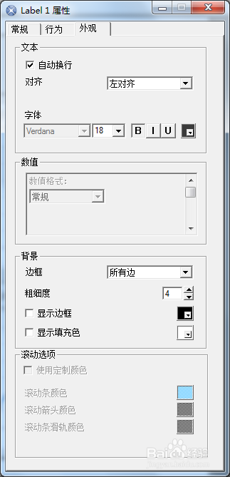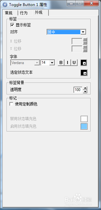 標(biāo)題標(biāo)簽部件的設(shè)置。在“常規(guī)”選項(xiàng)卡中輸入標(biāo)簽內(nèi)容,在“行為”選項(xiàng)卡中可設(shè)置動(dòng)畫(huà)和效果,在“外觀”選項(xiàng)卡中可設(shè)置文本的字體、大小、顏色、邊框等。