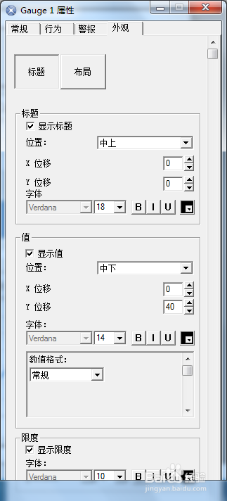 量表部件的設(shè)置。選擇第一個(gè)量表,將它的標(biāo)題設(shè)置為SheetZ的AIO,值設(shè)置為B門O,最小值限制為O,最大值限制為5000;啟用警報(bào),占目標(biāo)百分比設(shè)置為SheetZ的C10,百分比可根據(jù)需要輸入,顏色也可更改;顏色順序選擇“高值為好”。第二個(gè)、第三個(gè)量表的設(shè)置與此類似,第二個(gè)量表的最大值限制為1000,第三個(gè)量表的最大值限制是3000。