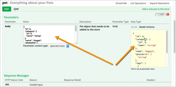 1.展開 pet 的 post 方法;2.然后單擊 Model Schema 中的黃色字體的 JSON。