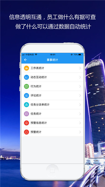 1.“事事“模塊“事事“模塊是事事明的核心功能模塊。企業(yè)成員可以在這里發(fā)布自己的工作動(dòng)態(tài)、瀏覽其他相關(guān)的工作動(dòng)態(tài)。同時(shí)還提供考勤、任務(wù)、預(yù)警、工作表、統(tǒng)計(jì)等功能,支持企業(yè)日常的工作管理。