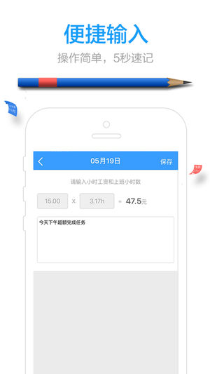 1、快速記工時:設(shè)置好小時工資后,每天記錄工時,就可以自動幫您計算工時收入2、支持添加多個小時工資:用戶可添加多個工廠的小時工資,記錄時可根據(jù)實際情況進行選擇