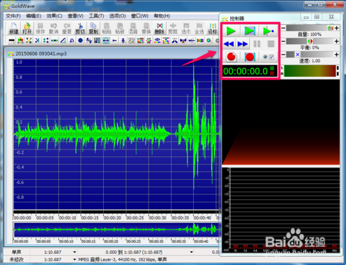 1、安裝完成后(如果需要安裝),打開(kāi)我們要剪輯的音樂(lè)文件。如圖,右邊的控制器是可以通過(guò)按鈕來(lái)控制音樂(lè)的播放與暫停等,這個(gè)有助于我們?cè)诩糨嫷倪^(guò)程中試播。