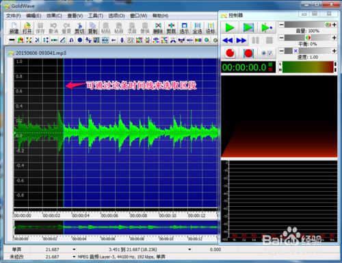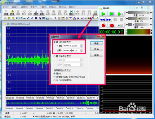 2、選取區(qū)段的其中一個(gè)辦法是可以通過(guò)軟件的“設(shè)標(biāo)”功能來(lái)準(zhǔn)確定位音樂(lè)的時(shí)間軸(示例為選取原音樂(lè)15秒開(kāi)始到36.68735秒結(jié)束),也可以通過(guò)拉動(dòng),如圖1、圖2;另一個(gè)辦法是通過(guò)時(shí)間線來(lái)拖拉定位音樂(lè),如圖3