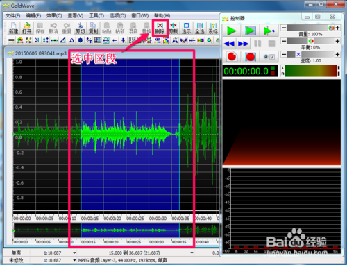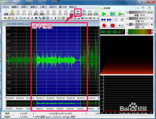 3、以設(shè)標(biāo)選取為例,我們現(xiàn)在選中了“原音樂(lè)15秒到36.687秒”這個(gè)區(qū)段,這時(shí)你如果想保存這一段,可以點(diǎn)擊“剪裁”;如果你想刪除這一段,可以點(diǎn)擊“刪除”
