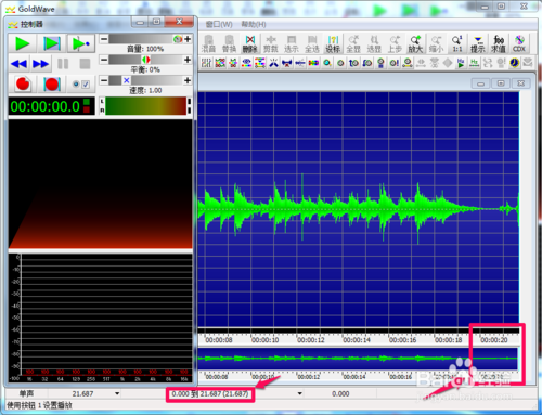 在波形顯示區(qū)域的下方有一個(gè)指示音頻文件時(shí)間長(zhǎng)度的標(biāo)尺,它以秒為單位,清晰的顯示出任何位置的時(shí)間情況,這就對(duì)我們了解掌握音頻處理時(shí)間、音頻編輯長(zhǎng)短有很大的幫助,因此一定要在實(shí)際操作中養(yǎng)成參照標(biāo)尺的習(xí)慣,你會(huì)發(fā)現(xiàn)它將給你帶來(lái)很大的方便,同時(shí)在GoldWave中,我們改變顯示比例的方法很簡(jiǎn)單,用查看菜單下的放大、縮小命令就可以完成,更方便的是用快捷鍵Shift+↑放大和用Shift+↓縮小。