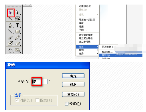 3、單擊左上方的【選擇工具】,調(diào)整一下矩形的位置,然后右擊,選擇【變換】【旋轉(zhuǎn)】命令。在彈出的的對(duì)話框中輸入值為15,單擊確定。效果如下: