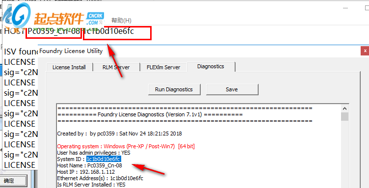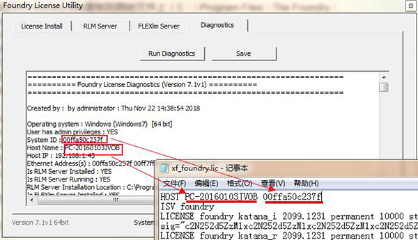 7、編輯xf_foundry.lic替換HOST_NAME MAC_ADDRESS PORT。您可以使用rlmutil.exe獲取這些信息,這是一個(gè)簡單的dos窗口ipconfig / all或者您可以啟動(dòng)Foundry License Utility并選擇Diagnostics —— Run Diagnostics,您將找到您的主機(jī)名,您的mac地址(系統(tǒng)ID)然后保存