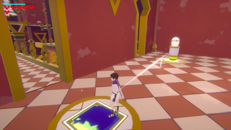 作為3D冒險解謎游戲,除了移動、跳躍、沖刺、下蹲這些常見操作外,游戲最大的創(chuàng)意和核心玩法在于加入了光劍系統(tǒng)。這套系統(tǒng)的基礎原理為在合適位置引爆光劍用以觸發(fā)機關和造成傷害,五種關于光劍的操作——招劍、揮砍、插劍、延遲爆劍和遠程射箭各具作用又相互影響,構成了復雜多變的玩法機制。比如在一定距離內(nèi)連續(xù)插劍,那么幾把劍就會以光線相連,可以進行連續(xù)引爆;又比如在一定位置插劍之后,可以在合適的時機在遠程通過射箭引爆等等。游戲進程中你也會發(fā)現(xiàn)一些看似效果重合的操作,其實往往也各具妙用。